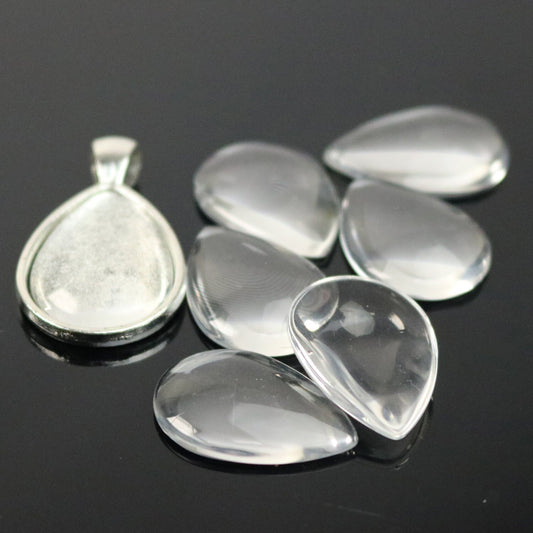 Pendant BEZELS with GLASS Magnifying Tear Drop Domes Cabochon - 5 sets 10 pcs - 18x25mm 3/4x1 inch Antique Silver Bezel and Glass Cabochon