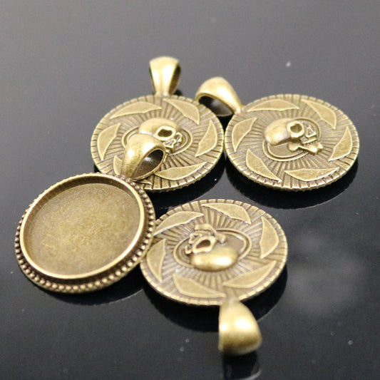 Pendant SKULL Bezels with GLASS Magnifying Domes Cabochon - 5 sets 10 pcs - 20mm 13/16 inch Antique Brass Bezel and Circle Glass Cabochon