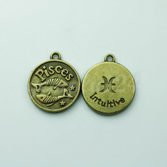 Zodiac Charm, Message Charm - Antique Brass - 28mm 3mm thickness 2.5mm Hole - Pisces - February 19- March 20
