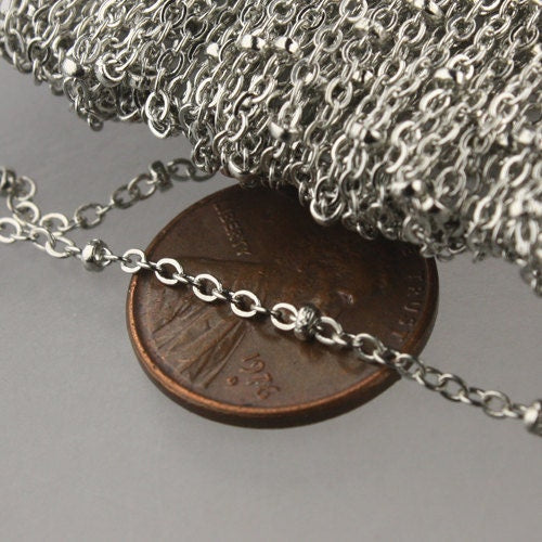 32 ft Antique Silver Rhodium Plated Satellite Chain Flat BALL Chain - 3x1.7mm SOLDERED link - Rhodium Tiny Small Ball Flat Cable - 317SAT