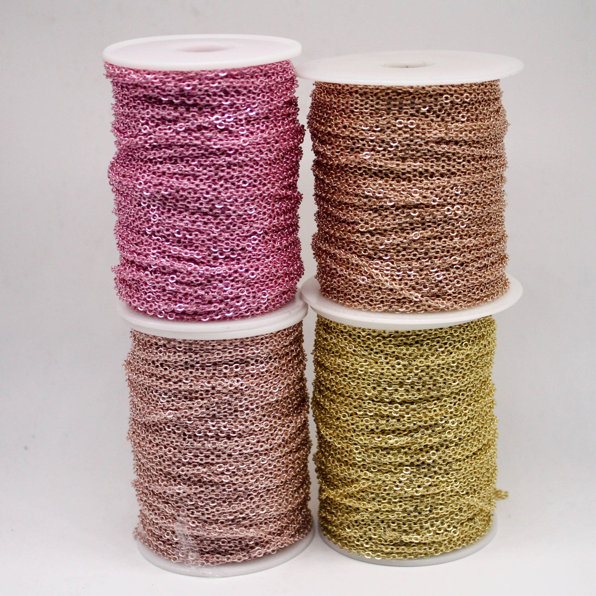 It won't tarnish. About 2.8mm width and 3.4mm Flat Soldered Link Cable Chain. Anti Tarnish/non tarnish/tarnish resistant Plating on Chain Surface. there are 4 different colors, 18K Gold Color/Rose Gold/Champagne Gold/Pink (Copper) Color. and there are 5 different Length of Chain 3 feet Sample to 300 feet Plastic Roll Size. The material is Copper Filled base on Iron Steel.