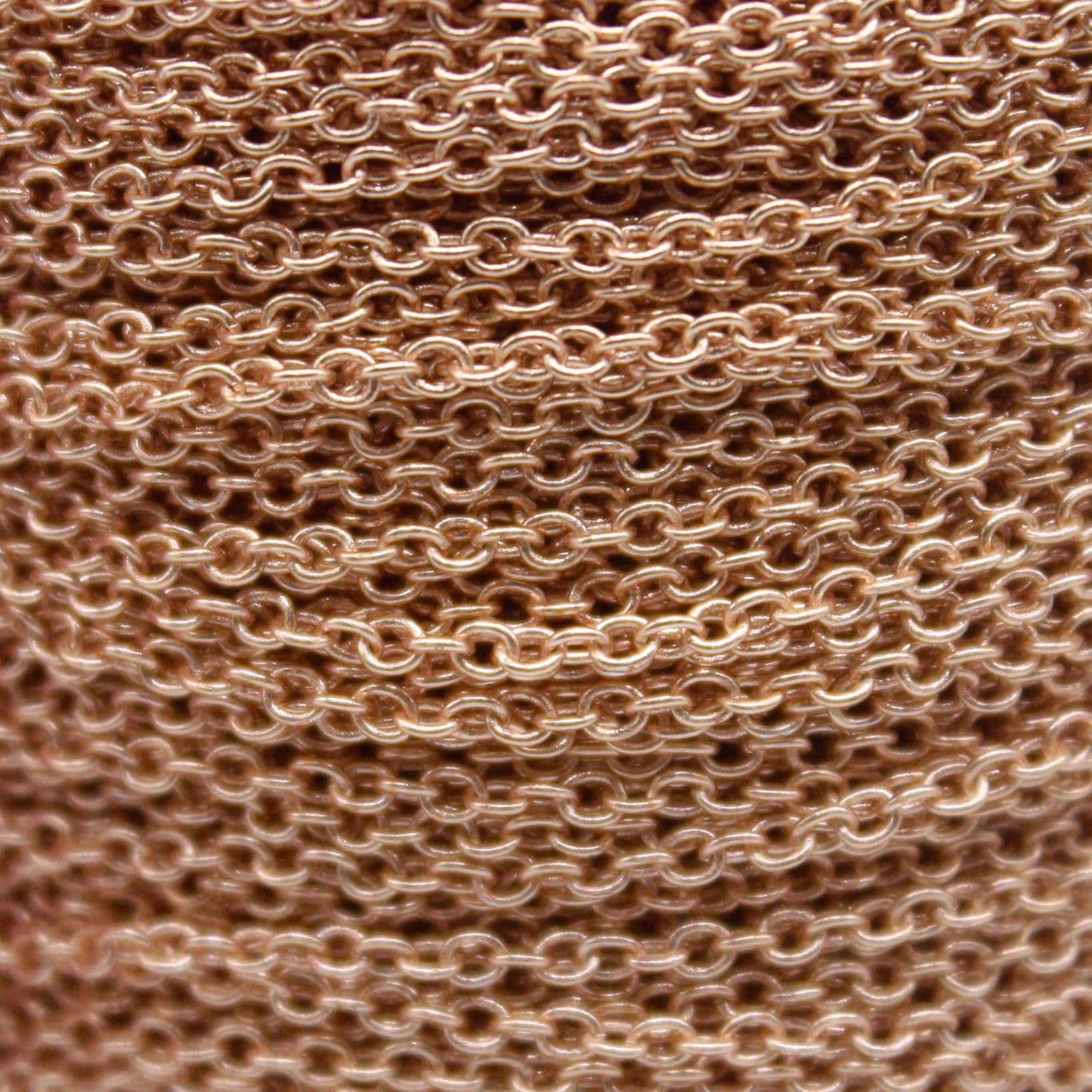 It won't tarnish. 1.4mm width and 2.0mm Length Soldered Link Small Tiny Cable Chain. Anti Tarnish/non tarnish/tarnish resistant Plating on Chain Surface. there are 4 different colors, 18K Gold Color/Rose Gold/Champagne Gold/Pink (Copper) Color. and there are 5 different Length of Chain 3 feet Sample to 300 feet Plastic Roll Size. Matieial is Copper Filled base on Iron Steel.