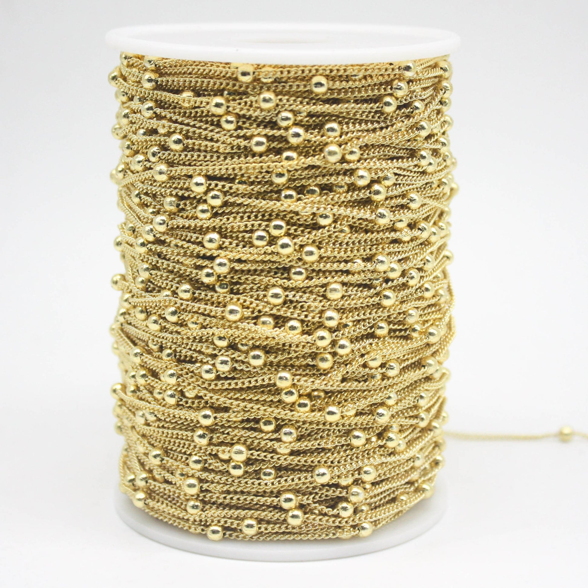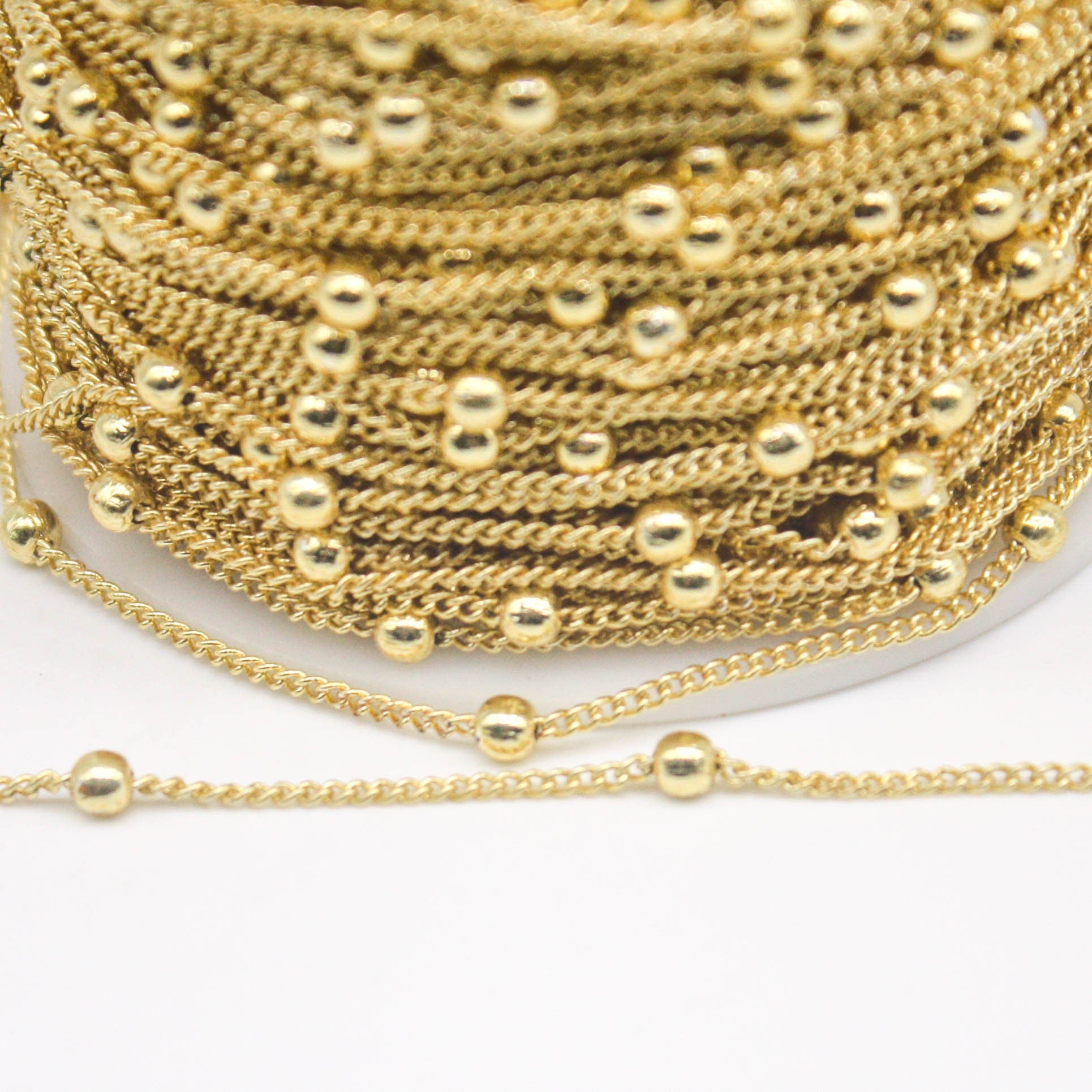 300 Ft Non Tarnished Satellite Curb Chain 18K Gold Plated - 1.6mm Curb 3.5mm Large Beads - Anti Tarnish Free Chain - AT1.6SATBB